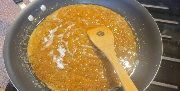 Add 1/2 cup of butter and 1 cup of packed brown sugar in a large frying pan and heat over medium heat. Stir frequently until the butter has fully melted and the mixture is smooth and no clumps of brown sugar remain. It's ok if the butter and brown sugar aren't fully combined. The mixture will come together once we mix in the remaining ingredients. Remove from heat.
